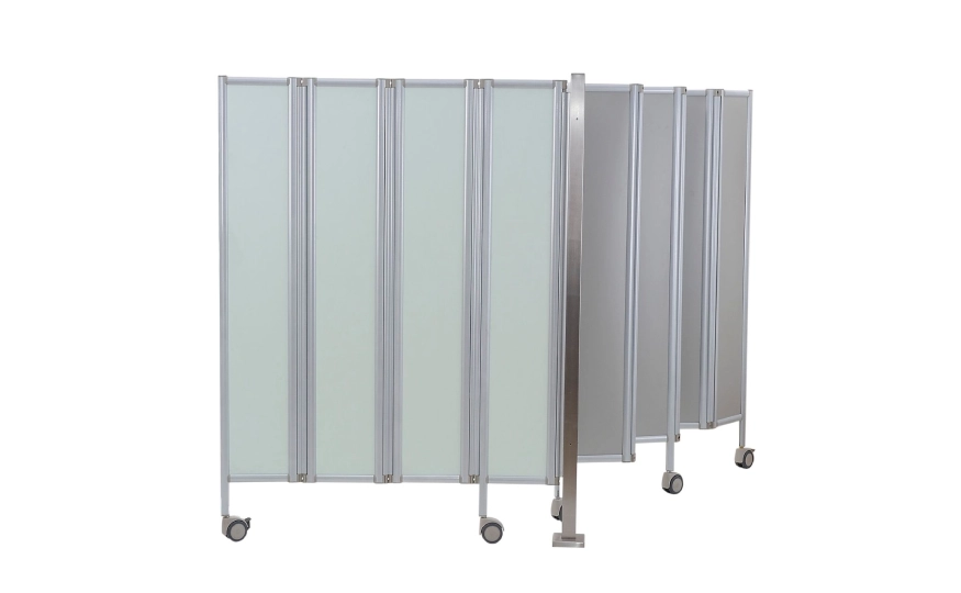 Biombo fixo modular, com faces em estrutura de perfil de alumínio extrudado e fechamento em policarbonato de diversas cores, ideal para divisão de espaço dentro de um mesmo ambiente, com beleza, privacidade, etc.