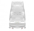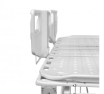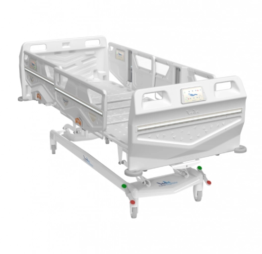 O leito possui extensor e foi desenvolvido em material termoplástico. São diversos os acessórios para essa cama e como destaques de exclusividade, a mesa de refeição acoplada nas grades e a tábua para massagem cardíaca.