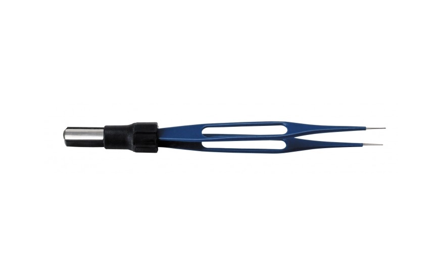 Pinça bipolar autoclavável 12 cm, reta, ponta curva Ø 0,5 mm, para oftalmologia.